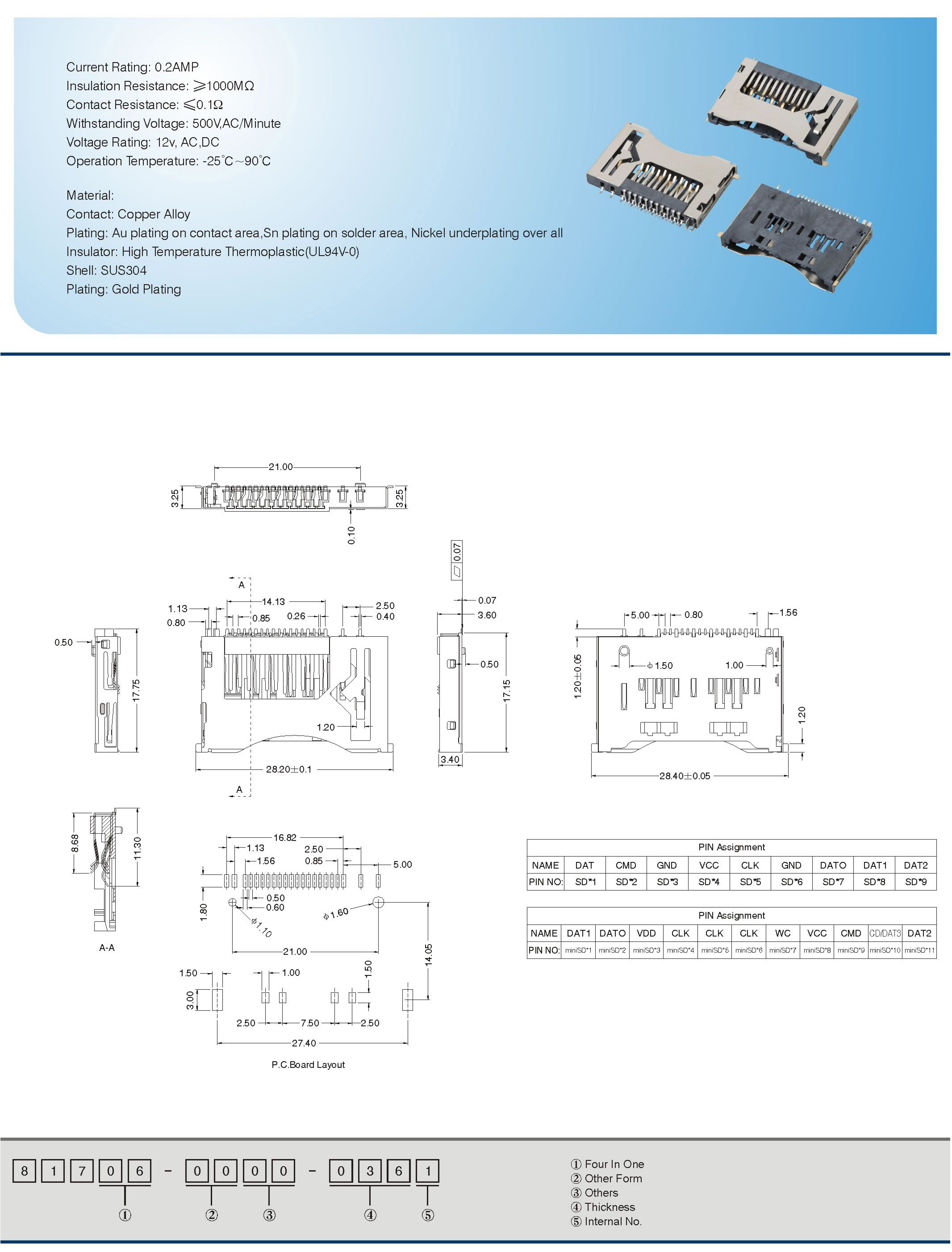 Plating: Au plating on contact area,Sn plating on solder area,Nickel underplating over all